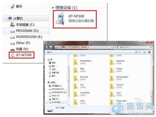 如果电脑系统禁用了自动播放功能,我们可以打开我的电脑,便携设备中看到名为GT-N7100的设备,点开之后可以直接对Note II的机身内存以及Micro SD内存卡进行读写操作,非常方便。