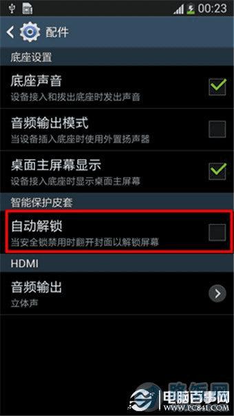 智能手机发展迅速其周边产品也跟着越来越有科技含量了。例如三星Galayx S4专用智能皮套上方有一块透明的小窗口,通过小窗口可以显示通知栏、时间、日期、未读短信、未接来电等内容,还可以设置皮套开盖自动解锁。今天小编就分享下设置皮套开盖自动解锁方法: