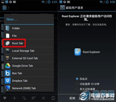 要用安卓设备找回WIFI密码的话,需要你的安卓手机已经获得ROOT权限,而且连到了目标WIFI网络中。确定好上面两个条件后,需要你安装一个可以查看ROOT文件夹的文件管理APP,小编在这推荐使用《RE管理器》。打开《RE管理器》以后点击下方的加号,然后选择“Root Tab”,这时如果没有给《RE管理器》赋予ROOT权限的话需要给它赋予权限,之后就能浏览ROOT文件夹了。