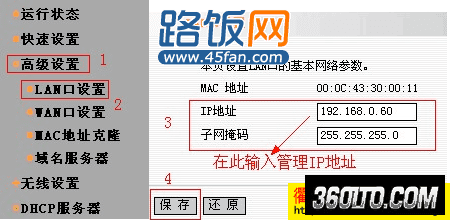 1、进入路由器WEB管理界面后,点击左边菜单“高级设置”-“LAN口设置”-在IP地址框输入管理IP地址(例如192.168.0.60)-点击“保存”,如下图: