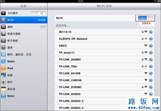 STEP1:打开IPAD主界面,选择“设置”菜单,选择“Wi-Fi”,进入Wi-Fi设置页面,如下图所示。