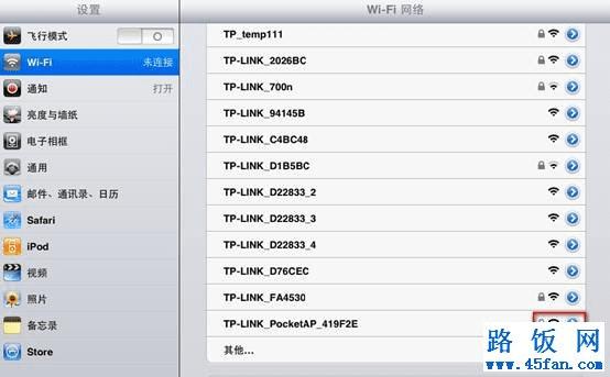 STEP3:选择任意一个无线网络右边的“>”按钮(本例中以TP-LINK_PocketAP_419F2E为例),弹出无线网络连接参数设置页面,如下图所示。