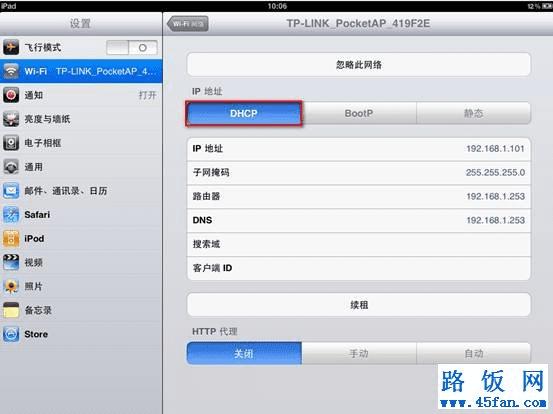 下图所示为配置DHCP,IPAD无线网络连接自动获取IP地址。