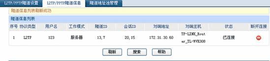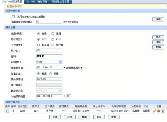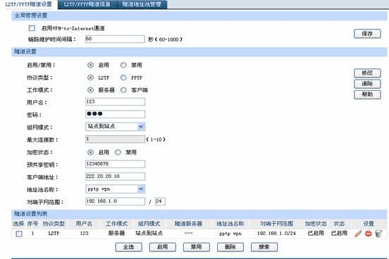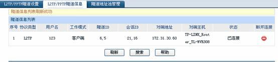 3. 客户端和服务器端条目建立后,都选择启用,成功建立后在服务器端和客户端的L2TP/L2TP隧道信息中将有条目: