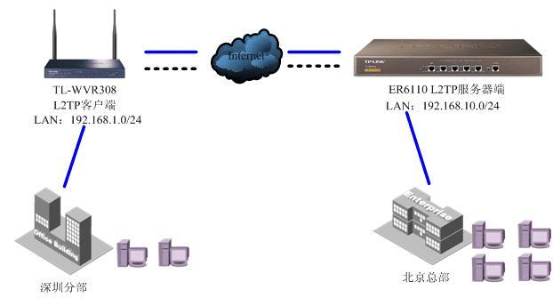 某公司总公司位于北京,分部在深圳,现需要组建一个网络,深圳的员工都能够安全的访问公司内部邮件服务器和文件服务器,本文将通过一个实例来展示TL-ER6120与TL-WVR300的解决方案和配置过程。