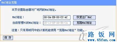 MAC地址克隆:某些地区的宽带运营商将用户的MAC地址做了绑定,用户可以利用此功能,复制宽带运营商绑定的MAC地址。如果用户可以正常上网,建议用户慎用该功能。