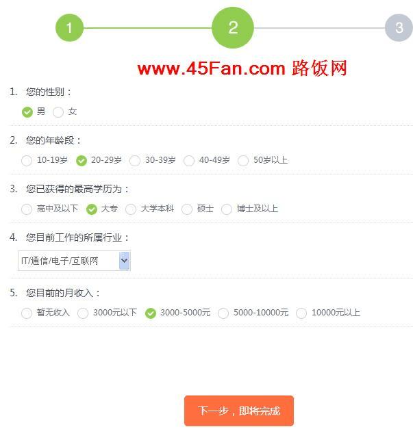 3、接着选择个人情况,如年龄段、工作收入、职业等,选择完成后,点下一步。如下图所示: