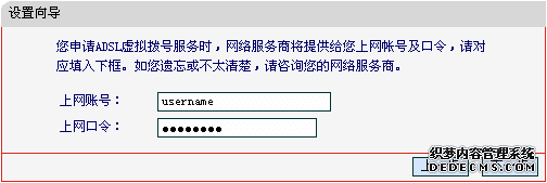 这里示例中演示的是一般家庭宽带用户所采用的PPPoE的上网方式,点击“下一步”后出现如下画面。填写ISP给我们提供的宽带用户名和密码。