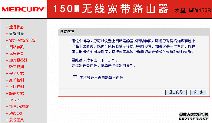 下面我们就介绍一下mercury无线路由器设置,文中以MW150R无线路由器为示例。如果路由器之前被设置过的请复位路由器后按教程操作。