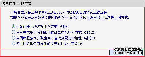 如果您不清楚您的上网类型,请选择让路由器自动选择上网方式,路由器会自动判断您的上网类型,然后跳到相应上网方式的设置页面。为了保证路由器能够准确判断您的上网类型,请确保您的路由器已正确连接。