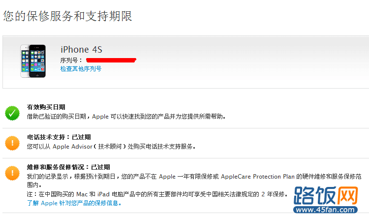 编后语:由于小编的iPhone4S是2012年3月26日购买的,一年的保修期早就过了,所以电话支持服务及保修服务都已过期。如果是在保修期内电话支持下方会显示激活日期,然后再与购买日期比对,相同则说明是正品行货。简单吧,通过以方法,即使你是手机小白以后再也不怕买到水货苹果iPhone手机了。
