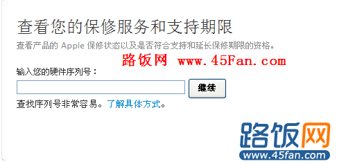 5、输入刚才记录下来的iPhone4S序列号,点【继续】,随即会显示机型、序列号、有效购买日期、维修和服务保修情况、电话支持等信息。如下图所示: