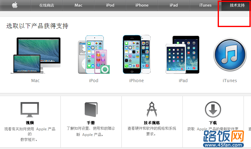 2、打开苹果官方网站(www.apple.com.cn),然后点导航栏最右边的【技术支持】链接,如下图所示: