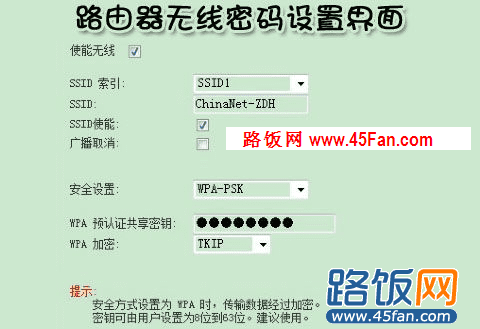 另外加密方式尽量采用WPA-PSK方式,目前WEP方式很容易遭到破解。