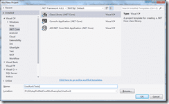 2.在test目录下新建一个.NET Core项目,这里选择的项目类型是Class Library(.NET Core),命名项目名为UseXunit.Tests