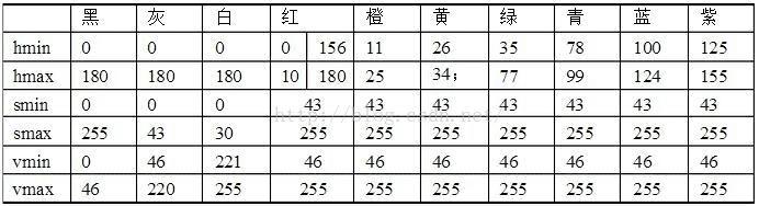 一般对颜色空间的图像进行有效处理都是在HSV空间进行的,然后对于基本色中对应的HSV分量需要给定一个严格的范围,下面是通过实验计算的模糊范围(准确的范围在网上都没有给出)。