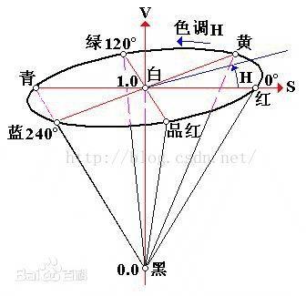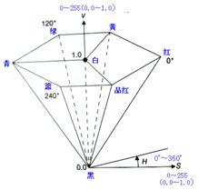 HSV(hue,saturation,value)颜色空间的模型对应于圆柱坐标系中的一个圆锥形子集,圆锥的顶面对应于V=1. 它包含RGB模型中的R=1,G=1,B=1 三个面,所代表的颜色较亮。色彩H由绕V轴的旋转角给定。红色对应于 角度0° ,绿色对应于角度120°,蓝色对应于角度240°。在HSV颜色模型中,每一种颜色和它的补色相差180° 。 饱和度S取值从0到1,所以圆锥顶面的半径为1。HSV颜色模型所代表的颜色域是CIE色度图的一个子集,这个 模型中饱和度为百分之百的颜色,其纯度一般小于百分之百。在圆锥的顶点(即原点)处,V=0,H和S无定义, 代表黑色。圆锥的顶面中心处S=0,V=1,H无定义,代表白色。从该点到原点代表亮度渐暗的灰色,即具有不同 灰度的灰色。对于这些点,S=0,H的值无定义。可以说,HSV模型中的V轴对应于RGB颜色空间中的主对角线。 在圆锥顶面的圆周上的颜色,V=1,S=1,这种颜色是纯色。HSV模型对应于画家配色的方法。画家用改变色浓和 色深的方法从某种纯色获得不同色调的颜色,在一种纯色中加入白色以改变色浓,加入黑色以改变色深,同时 加入不同比例的白色,黑色即可获得各种不同的色调。