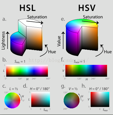 HSL代表色调(Hue),饱和度(Saturation)和亮度(Lightness),通常也称为HLS。HSV代表色调,饱和度和值(Value)。注意HSL 和HSV的两个H的含义是相同的,而饱和度的定义是不同的,虽然都叫饱和度,从后面的定义可以看出二者的不同。