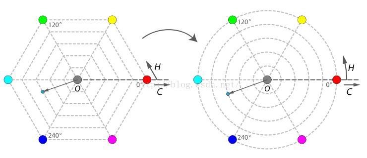 HSL 和 HSV 二者都把颜色描述在圆柱体内的点,这个圆柱的中心轴取值为自底部的黑色到顶部的白色而在它们中间是的灰色,绕这个轴的角度对应于“色相”,到这个轴的距离对应于“饱和度”,而沿着这个轴的距离对应于“亮度”,“色调”或“明度”。 HSV 以人类更熟悉的方式封装了关于颜色的信息:“这是什么颜色?深浅如何?明暗如何?”。HSL 颜色空间类似于 HSV,在某些方面甚至比它还好。HSL的模型为双圆锥形状。