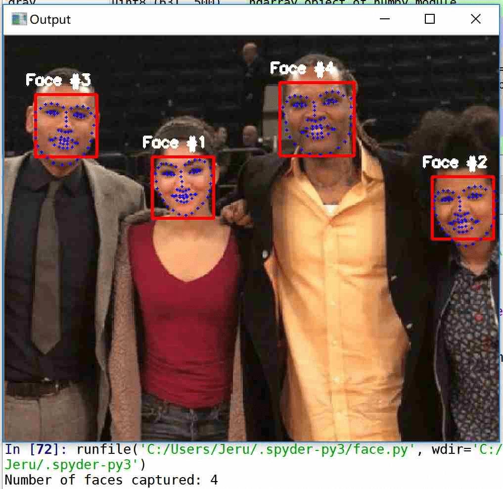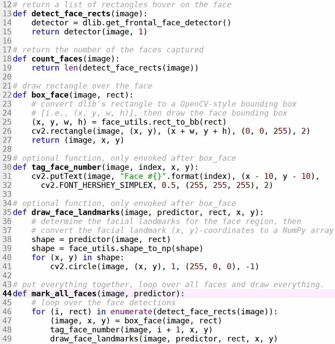我在Adrian大神的代码做了一点修改和封装,先定位脸部的方框,box_face画出方框,在此基础上可选调用tag_face_number来标注脸的标号或者draw_face_landmarks来标注特征点,也可以直接调用count_faces来统计脸的个数,mark_all_faces给所有的脸把所有信息都加上。