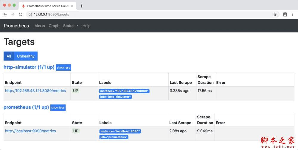 访问http://127.0.0.1:9090/targets ,Prometheus 自身的 metrics 和 http-simulator 的 metrics 处于up 状态 ,那么准备工作就做好了。