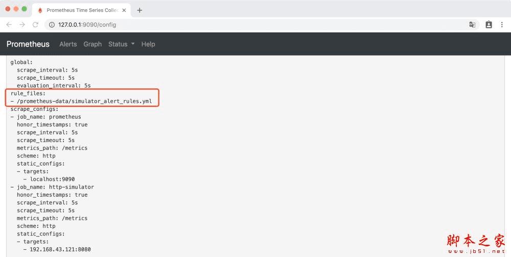 修改prometheus.yml,引用simulator_alert_rules.yml文件,prometheus.yml 内容如下: