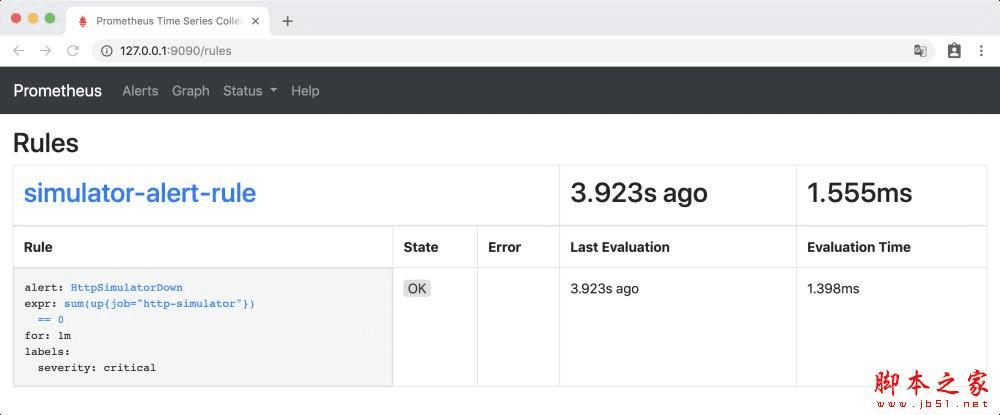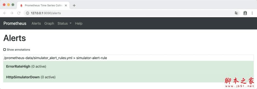 访问http://127.0.0.1:9090/alerts ,Alerts 下 HttpSimulatorDown 为绿色,处于INACTIVE 状态,表示什么都没有发生。