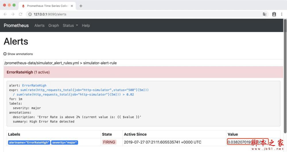 稍等一会后,访问http://127.0.0.1:9090/alerts, 可以看到错误率已经大2%,ErrorRateHigh 为红色的 FIRING 状态,报警已经被激活了。