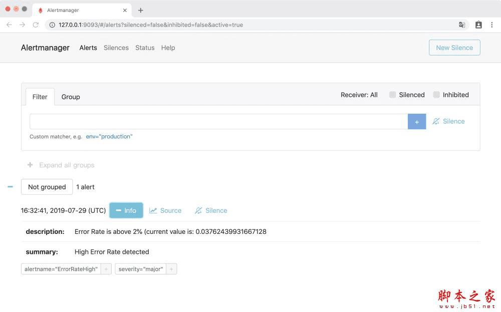 访问http://127.0.0.1:9093,访问Alertmanager UI界面,可以看到接收到ErrorRateHigh告警: