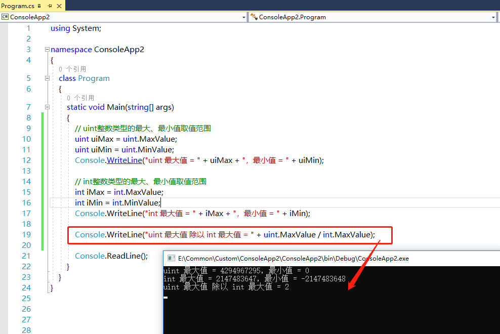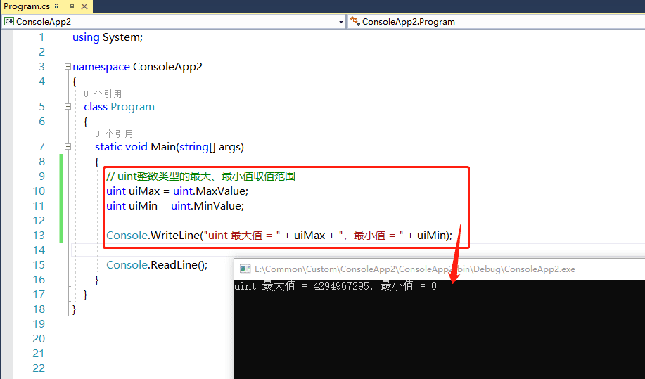 打开visual studio,创建一个控制台应用程序,本文的所有代码都在Program.cs文件的Main方法中进行演示。首先查看uint无符号整数类型的最大值 uint.MaxValue = 4294967295,最小值 uint.MinValue = 0