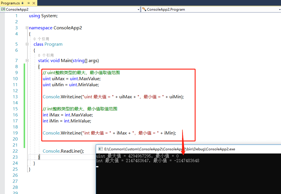 然后在Main方法中使用 int.MaxValue 获得int的最大值,int.MinValue 获得int的最小值。从运行结果来看,int有符号整数类型的最大值 int.MaxValue = 2147483647,最小值 int.MinValue = -2147483648