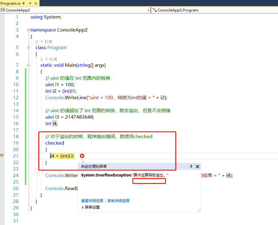 对于上面这种情况,假设程序中遇到了,还不报错,出现的问题会让人很费解。假设是银行的存款,因为多存了一块钱导致数字溢出,变成了负数,这是绝对无法原谅的。因此,在转换的代码外面加上checked关键字,在转换溢出的时候就会抛出异常,防止溢出