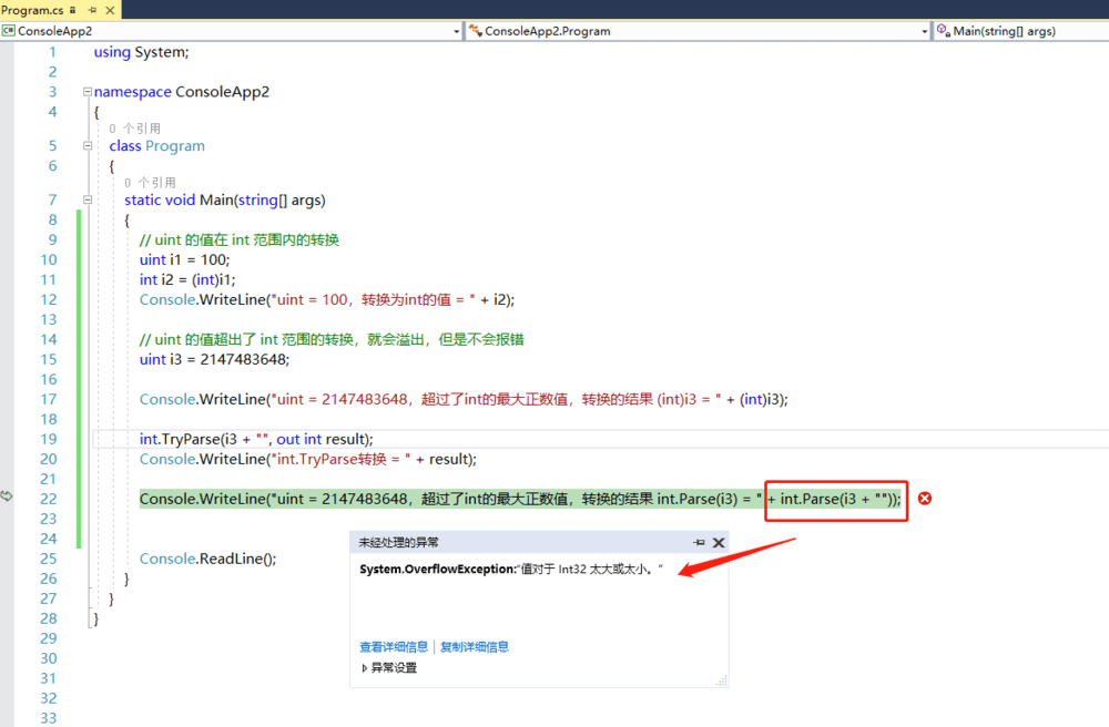 1)int.Parse强制转换,这种方式如果溢出了会直接报错,抛出异常