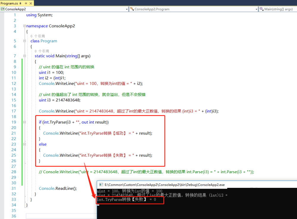 2)int.TryParse转换,如果数据溢出了,转换会返回false,也就是转换失败,不抛出异常