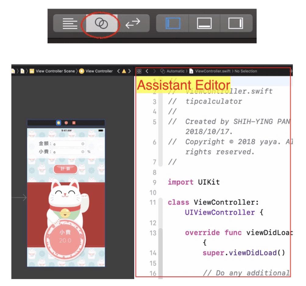 從前當我們想將 Interface Builder 的東西拉 outlet / action 到程式時,最重要的步驟莫過於點選右上角兩個圓圈的按鈕,打開顯示相關程式的 Assistant Editor (輔助編輯)畫面。