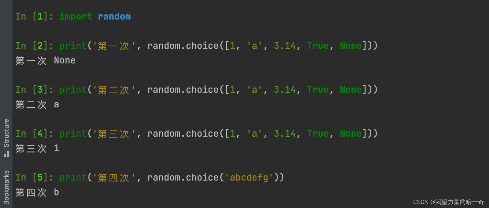 print('第三次', random.choice([1, 'a', 3.14, True, None]))