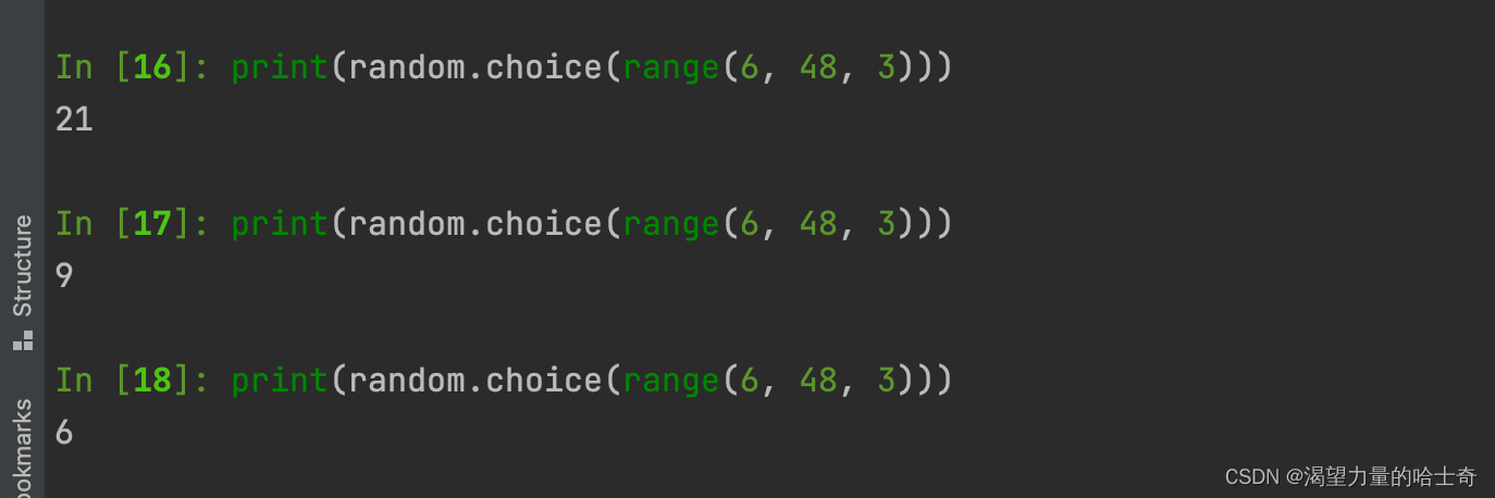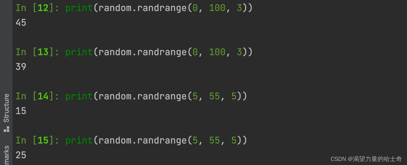 注意:randrange()函数的参数与range()相同,其功能相当于choice(range(start, stop, step)),但并不实际产生range对象,该函数返回值类型是int。