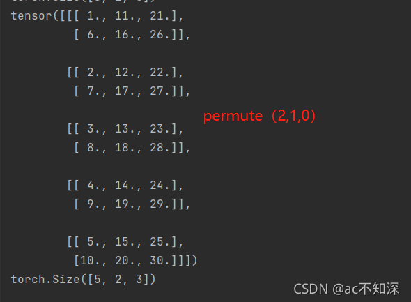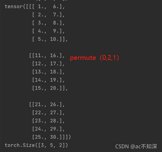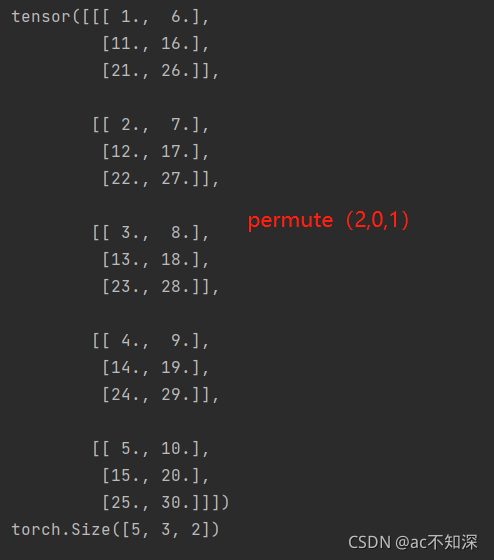 b = x.permute(0,2,1) # 每一块的行与列进行交换,即每一块做转置行为 print(b) print(b.size())
