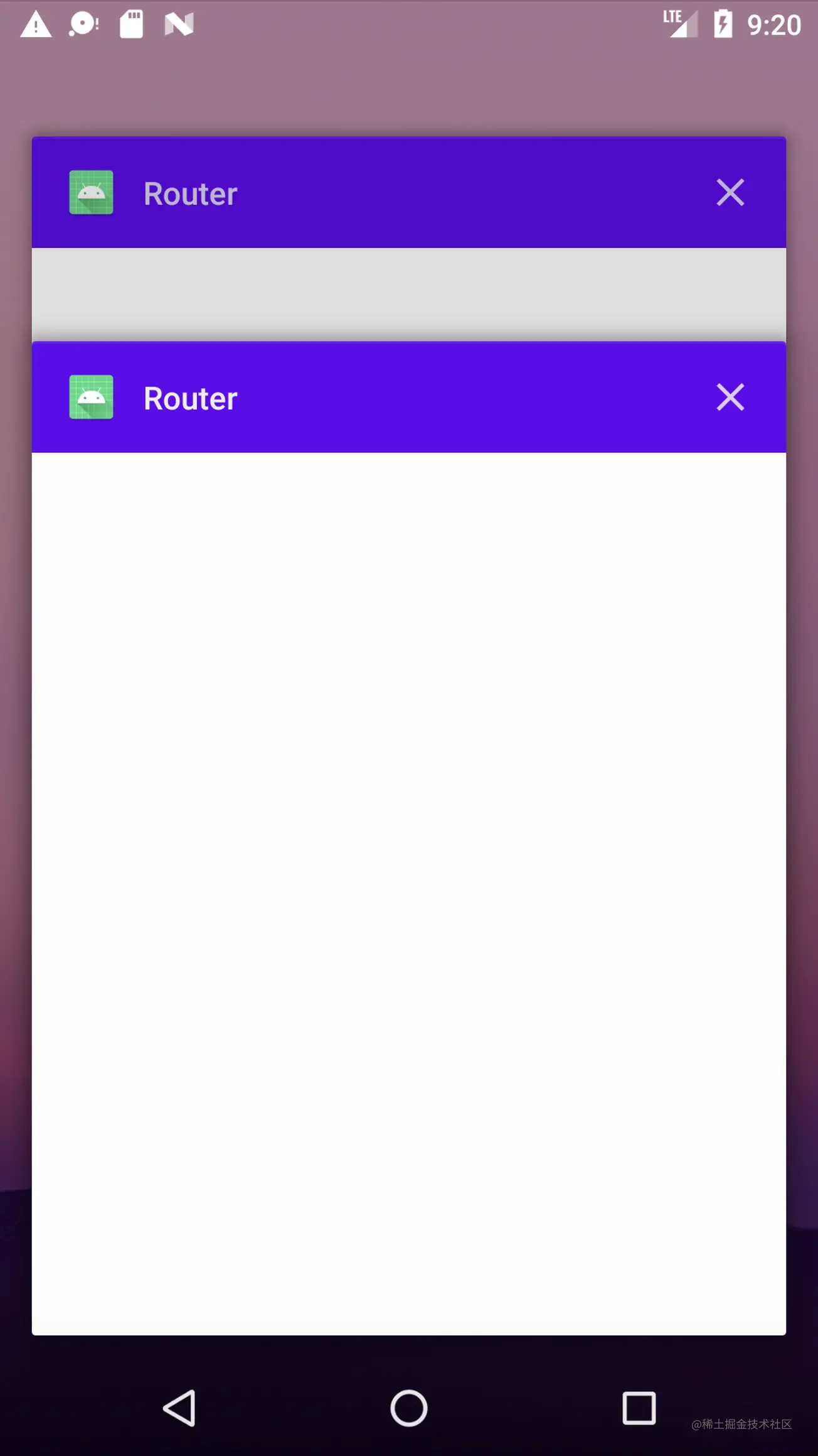 它们拥有相同的项目名称,因为只是名为router的app模块下的两个不同TaskAffinity的Activity,不过这个TaskAffinity并不显示在多任务视图当中。