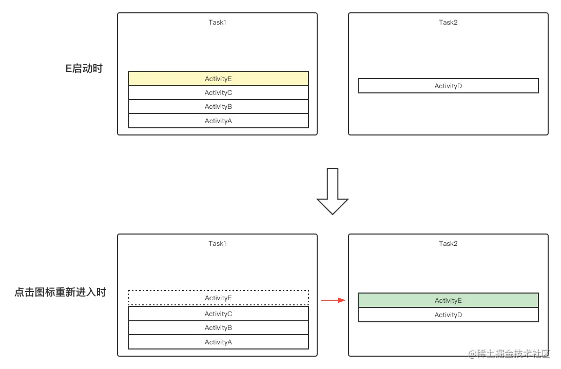 一旦我们切到桌面,再重新从桌面图标重新打开Task1时,我们会发现ActivityE从Task1中消失了,而从桌面打开Task2对应的App图标时,会发现,ActivityE重新回到了自己的Task2中,例如我们按照如下定义: