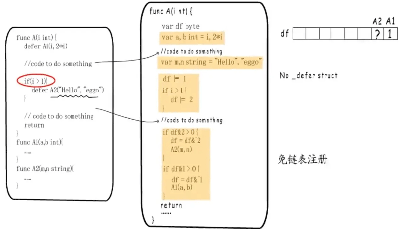 defer添加了局部变量去判断是否需要执行,需要执行的话就将标识df对应的位上或一下,如果是有条件的defer,需要根据具体条件去或df