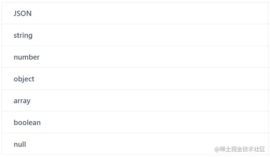 JSON Schema 核心定义主要以下这些数据类型,通过 type 来指定 JSON 数据类型