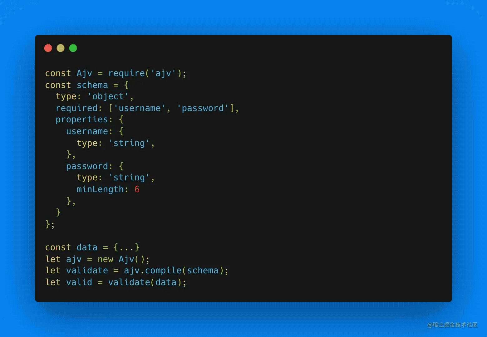上图为Ajv的具体使用,需要先声明一个数据模式schema,然后定义好规则(本质上是JSON Shema)然后我们再通过这个模式去校验用户输入的数据 data 是否符合我们的约束