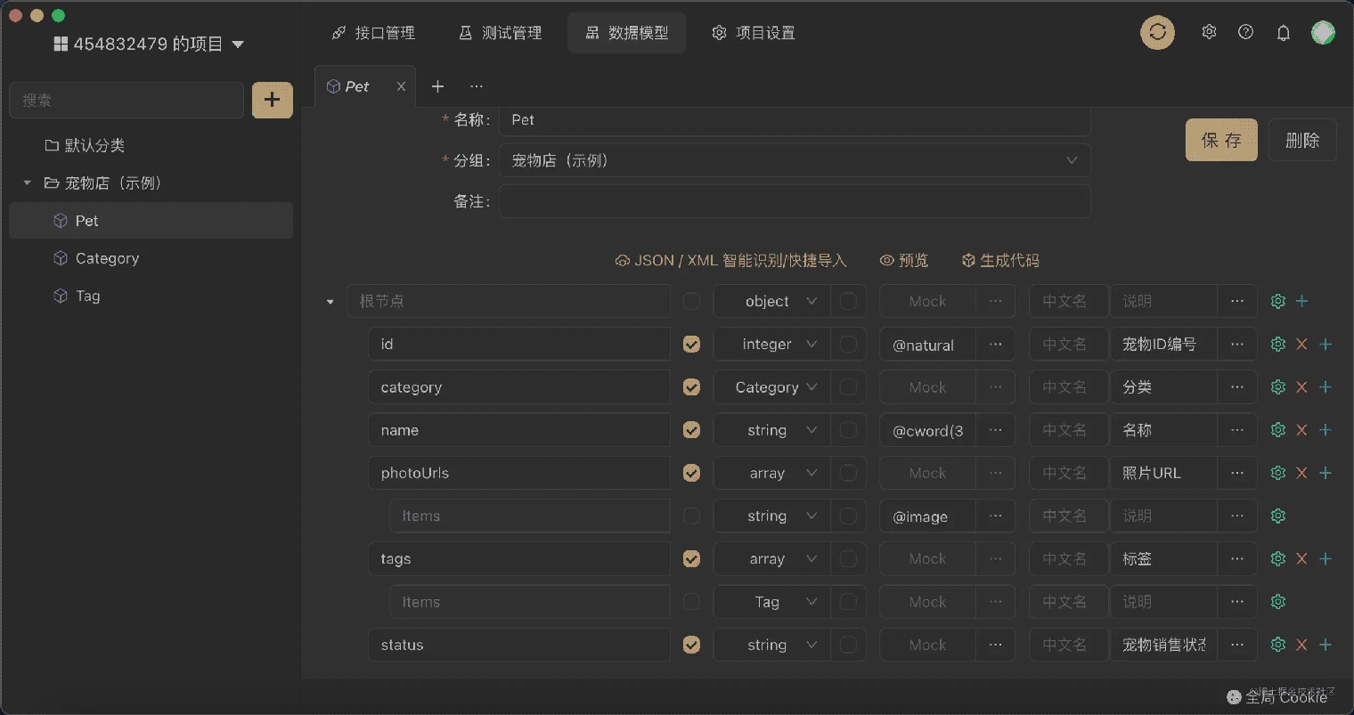 首先我们可以在数据模型模块中里创建一个Pet实体,然后再定义宠物相关的字段,我们可以字段类型(本质上是基于JSON Schema 用来做数据校验),甚至可以根据定义的字段类型来定义期望Mock返回数据形式 👇