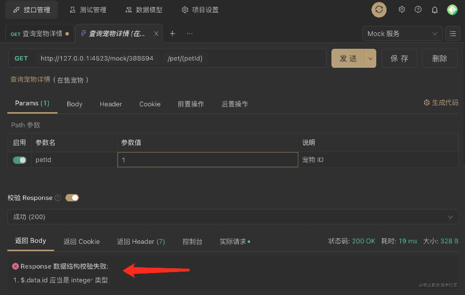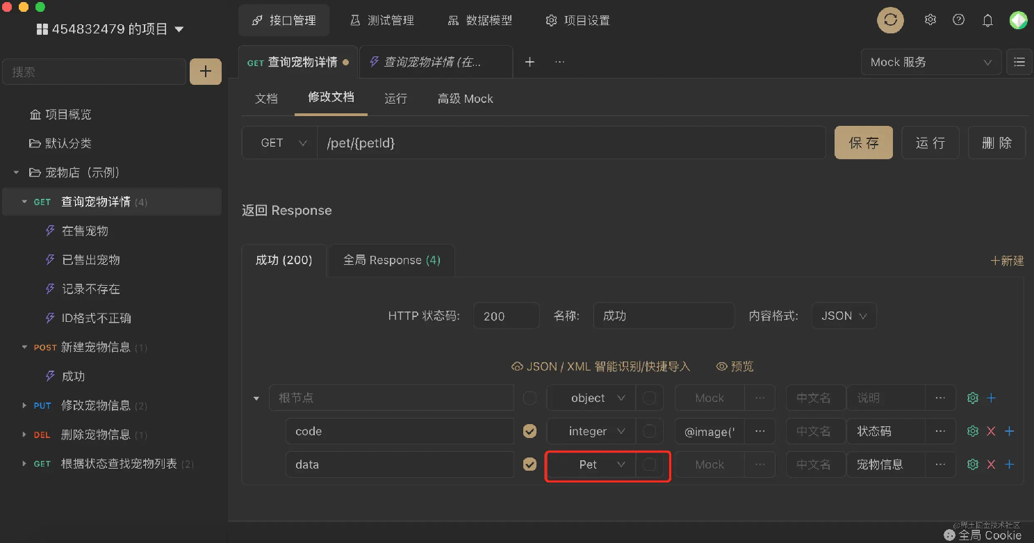 然后回到接口调试页面,我们在查询宠物详情这个接口中的data绑定我们预设好的实体Pet👇