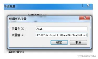然后在环境变量中添加配置,例如我把 openssl 安装在了 D:\OpenSSL-Win64,就将 D:\OpenSSL-Win64\bin 添加到 Path 中: