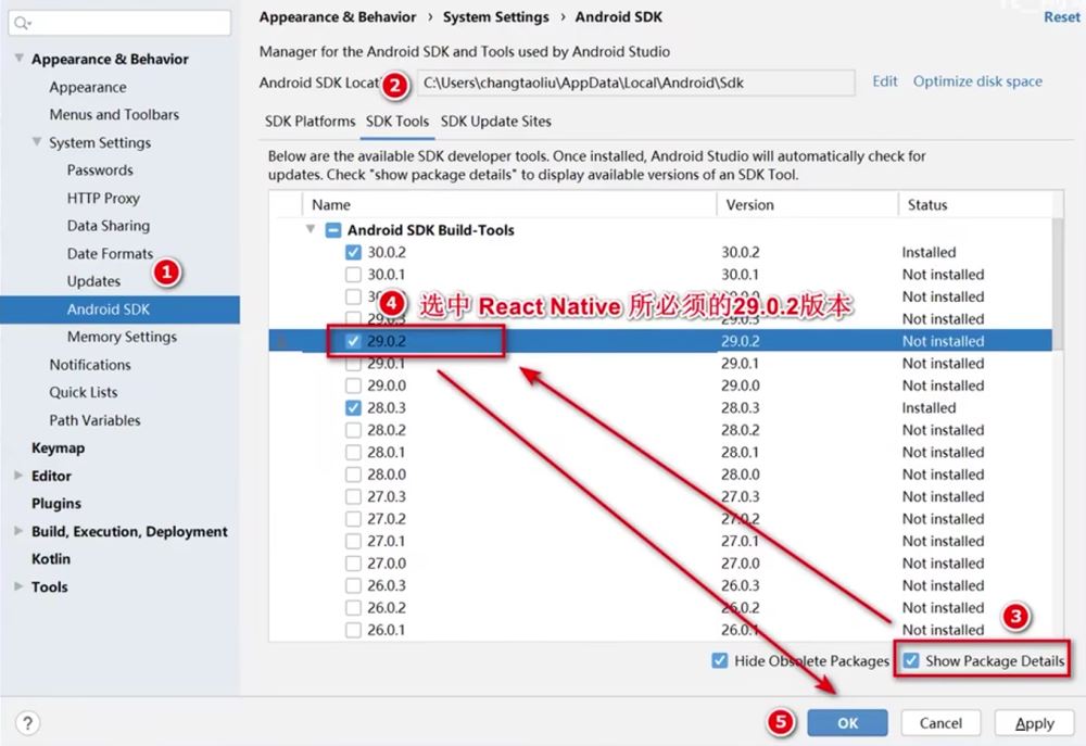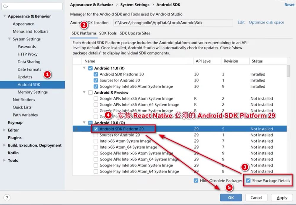目前编译 React Native 应用需要的是 Android 12 (S) 版本的 SDK (注意:SDK 版本不等于终端系统版本,RN 目前支持 android 5 以上设备)