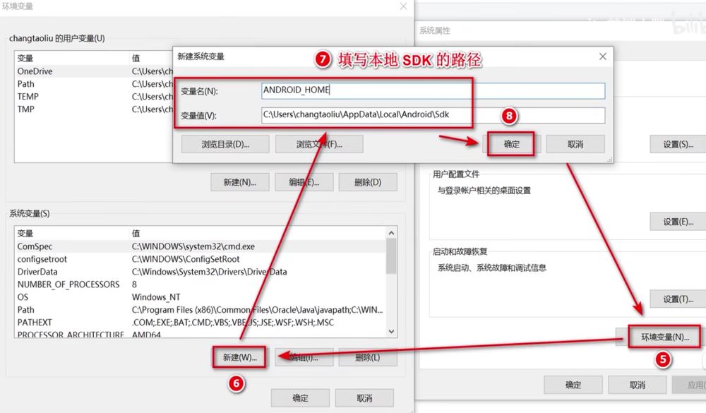 打开控制面板 -> 系统和安全 -> 系统 -> 高级系统设置 -> 高级 -> 环境变量,选中Path变量,然后点击编辑。点击新建然后把这些工具目录路径添加进去:platform-tools、emulator、tools、tools/bin