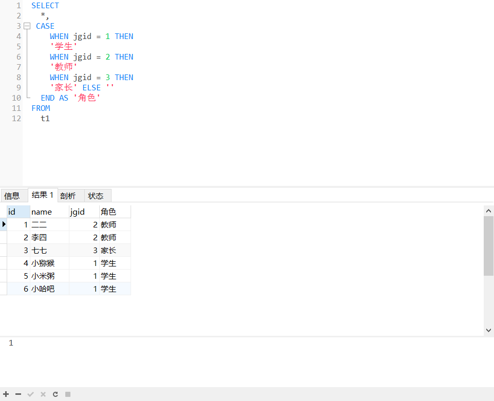 SELECT *, CASE WHEN jgid = 1 THEN '学生' WHEN jgid = 2 THEN '教师' WHEN jgid = 3 THEN '家长' ELSE '' END AS '角色' FROM t1