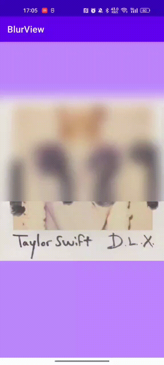 <androidx.constraintlayout.widget.ConstraintLayout ... android:id="@+id/rootView" android:background="@color/purple_200" > <ImageView ... android:id="@+id/imageView" /> <eightbitlab.com.blurview.BlurView ... android:id="@+id/blurView" /> </androidx.constraintlayout.widget.ConstraintLayout>